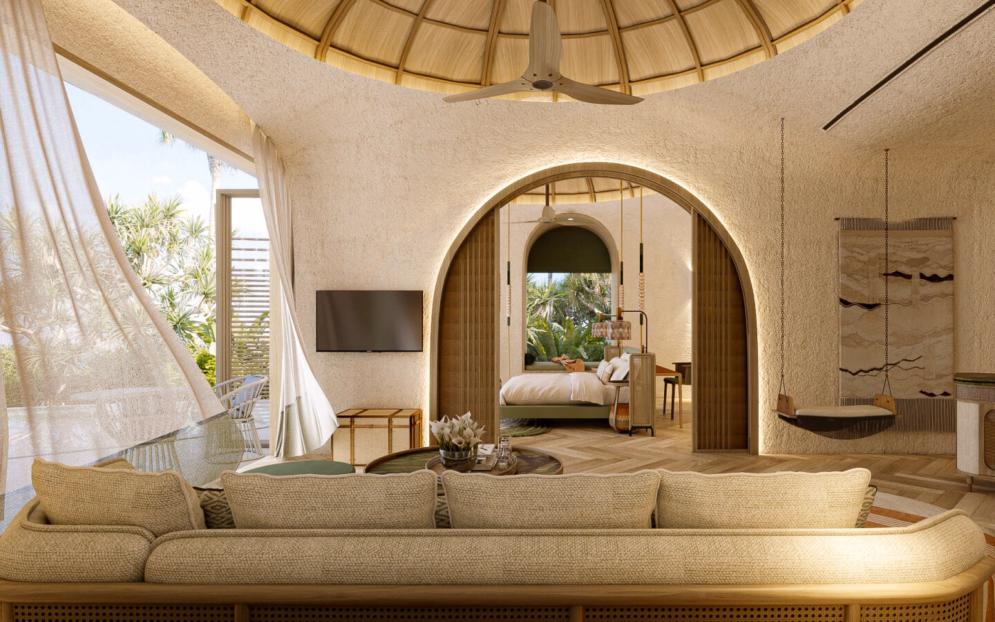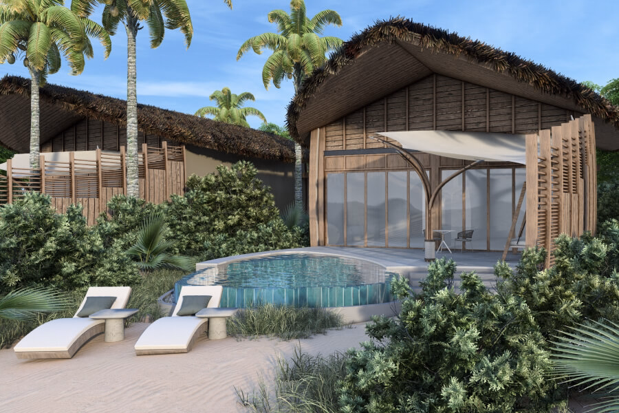 Three peaceful bedrooms surround open living spaces that extend to a palm-fringed terrace by the shore. Your private pool rests at the edge of the sand, inviting slow afternoons after barefoot walks along the beach and evenings spent together beside the sea.